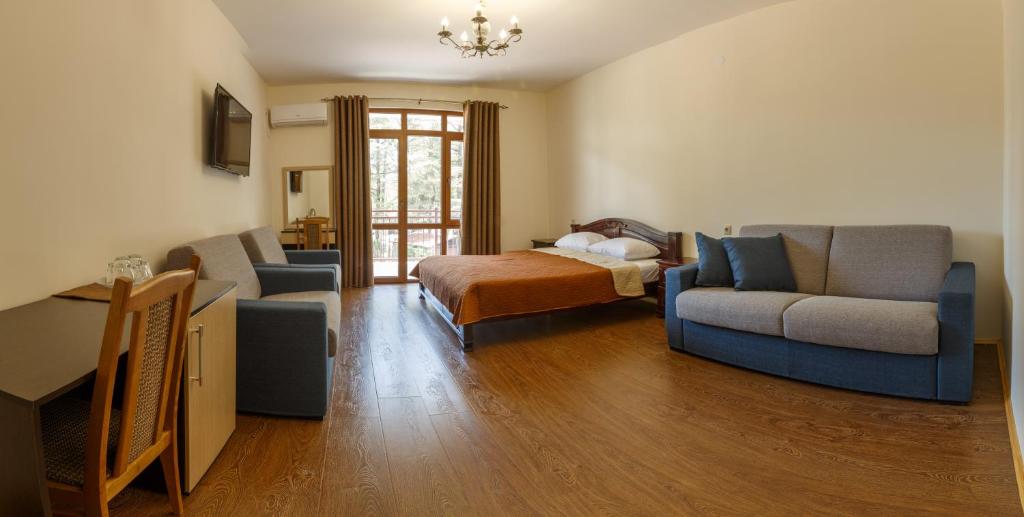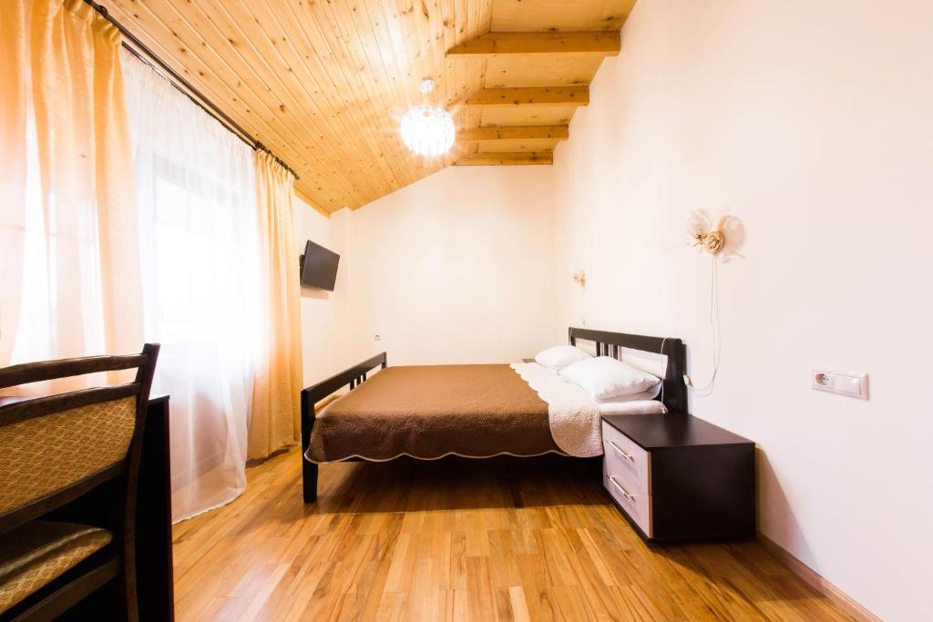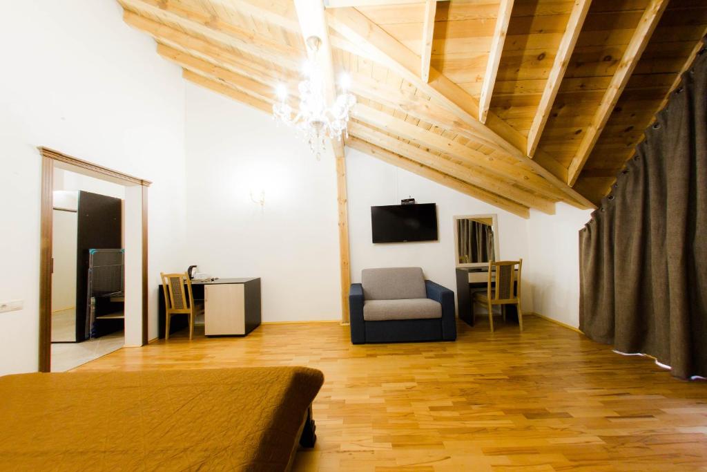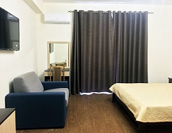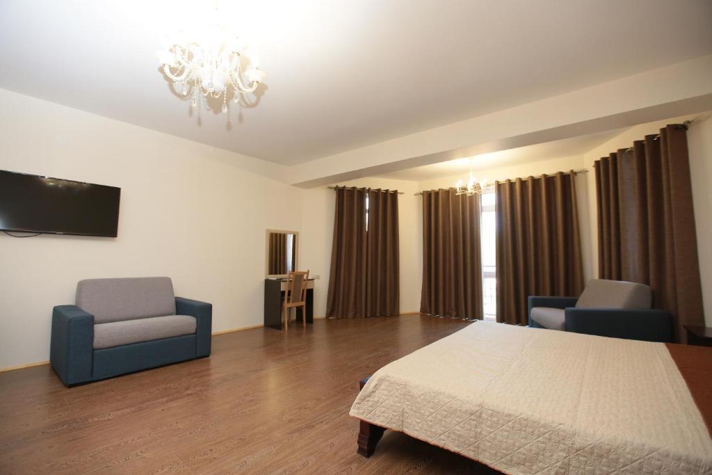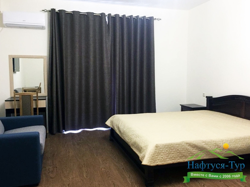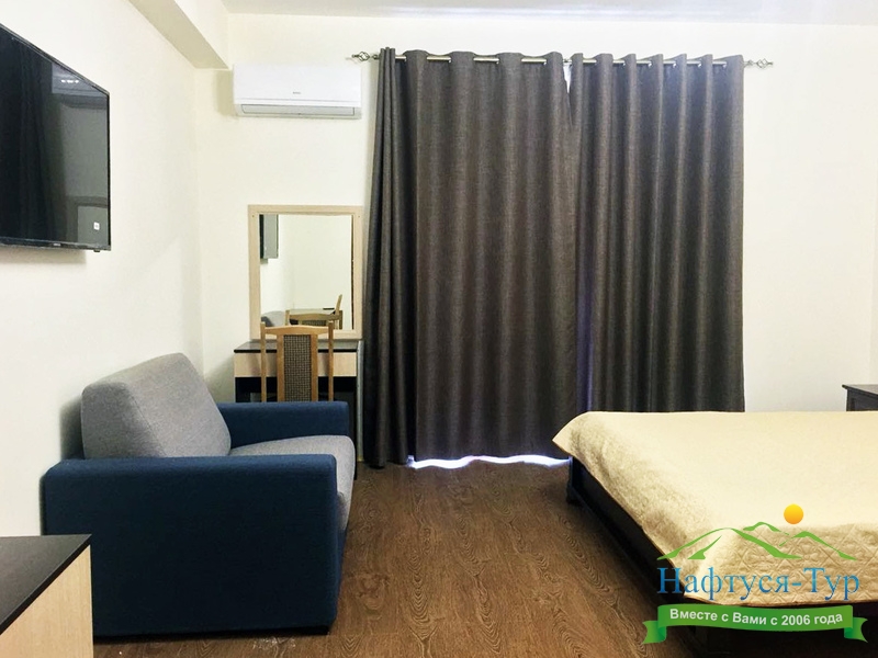 Мой отзыв очень положительный. Отель хороший. Номер соответствовал фото, по факту размеры намного больше. Мебель новая. Кровать большущая, не скрипит. Матрац супер. В номере электрочайник, стаканы, ложки, холодильник, сейф.