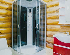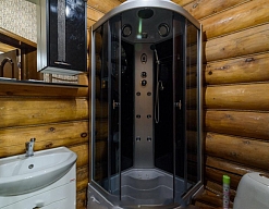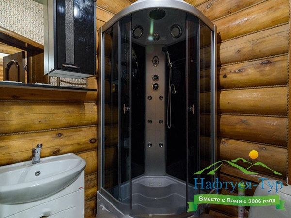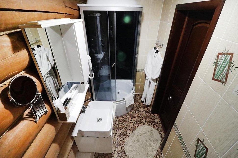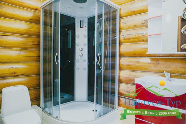 с душевой кабиной, тапочки, туалетные принадлежности, фен, халат