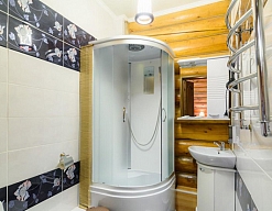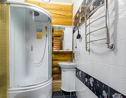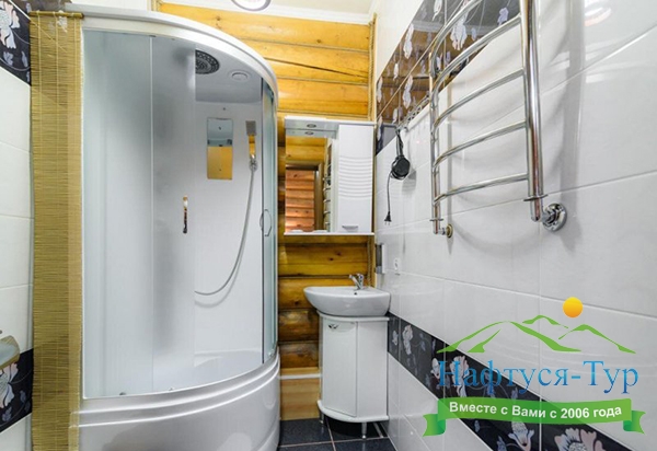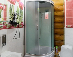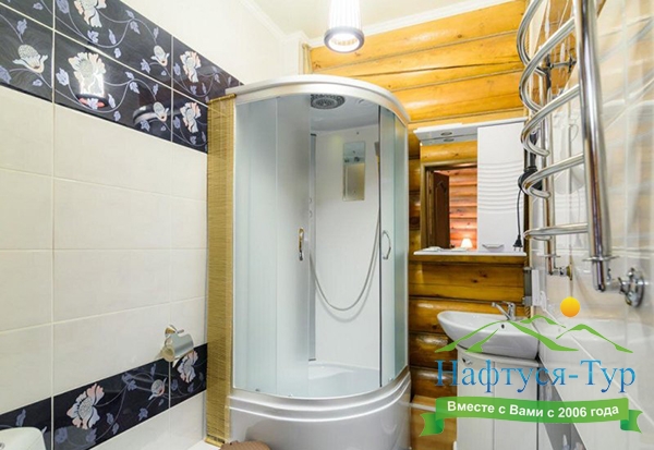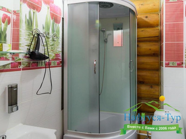 с душевой кабиной, тапочки, туалетные принадлежности, фен