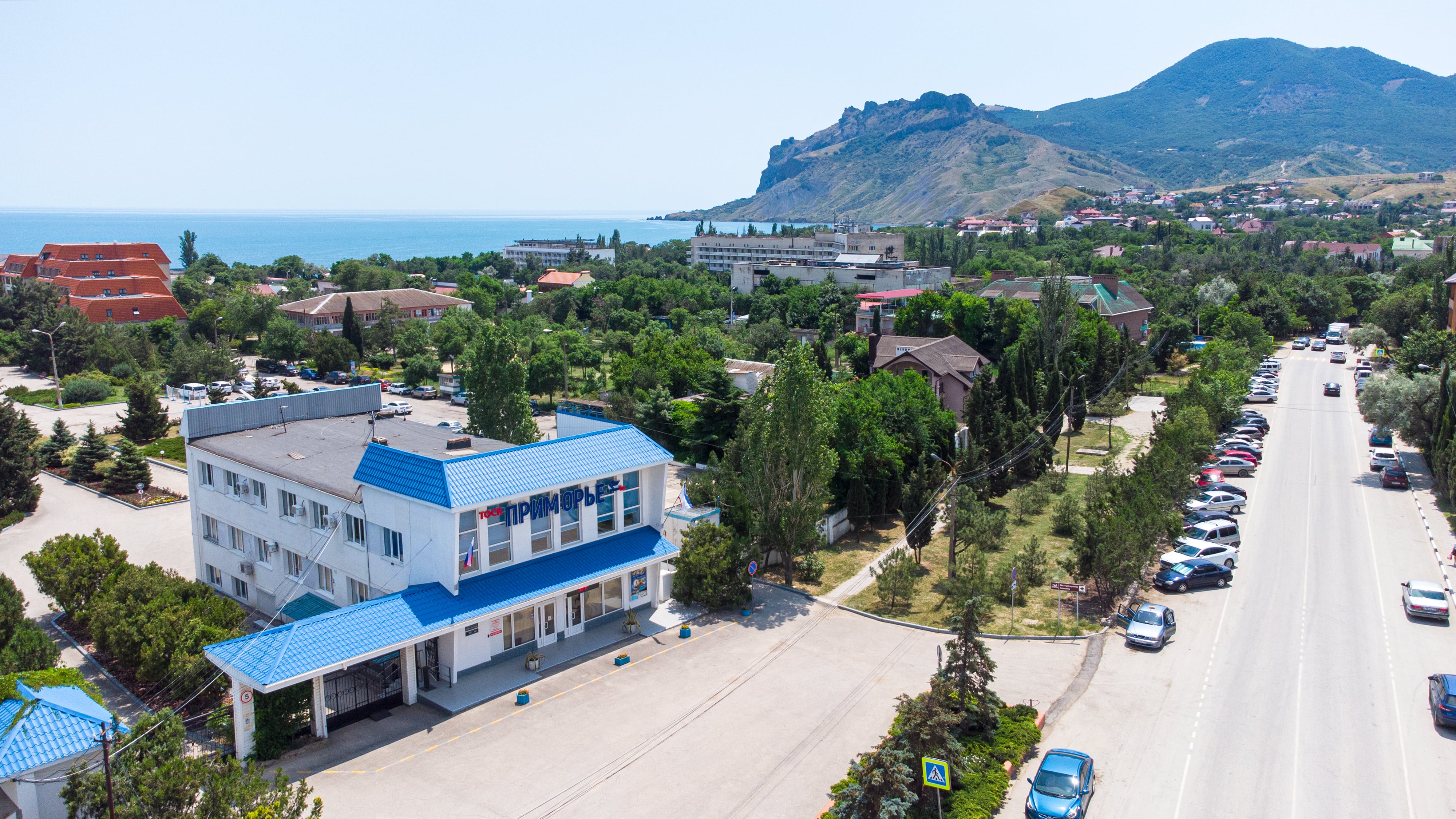 Оздоровительный комплекс «Приморье» расположен в курортном поселке Коктебель. Прилегающая территория к санаторию занимает около 11 гектаров.