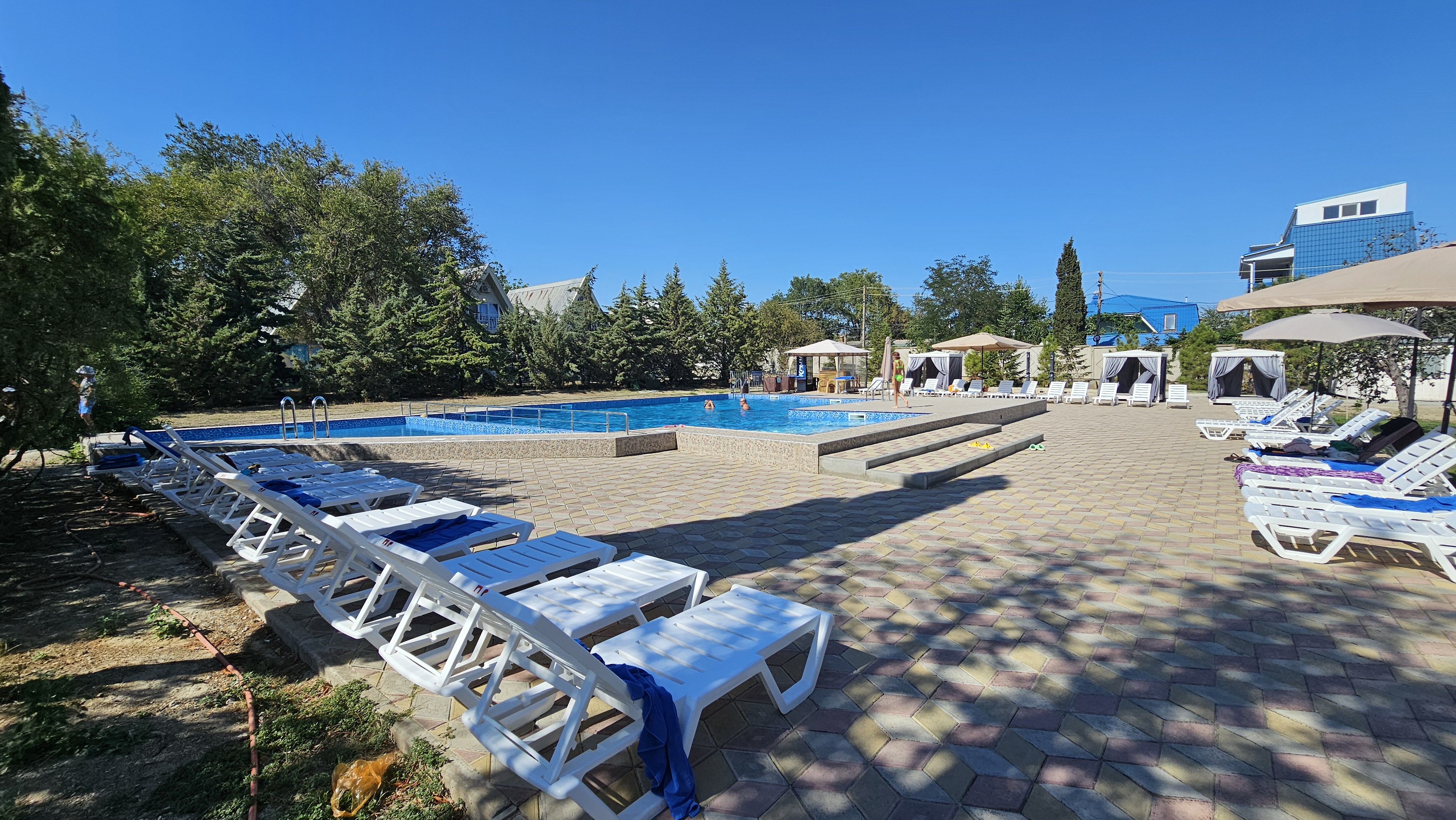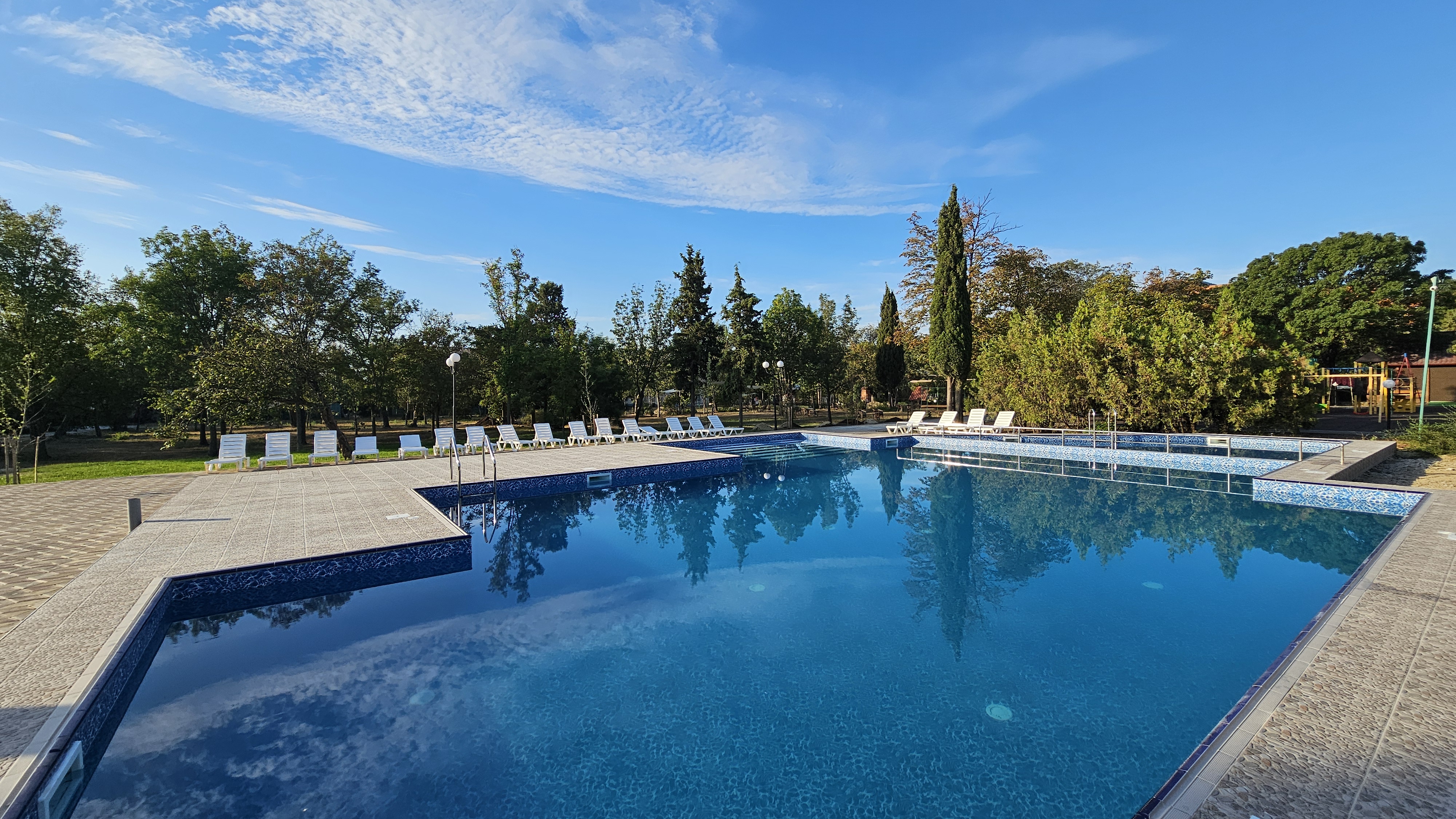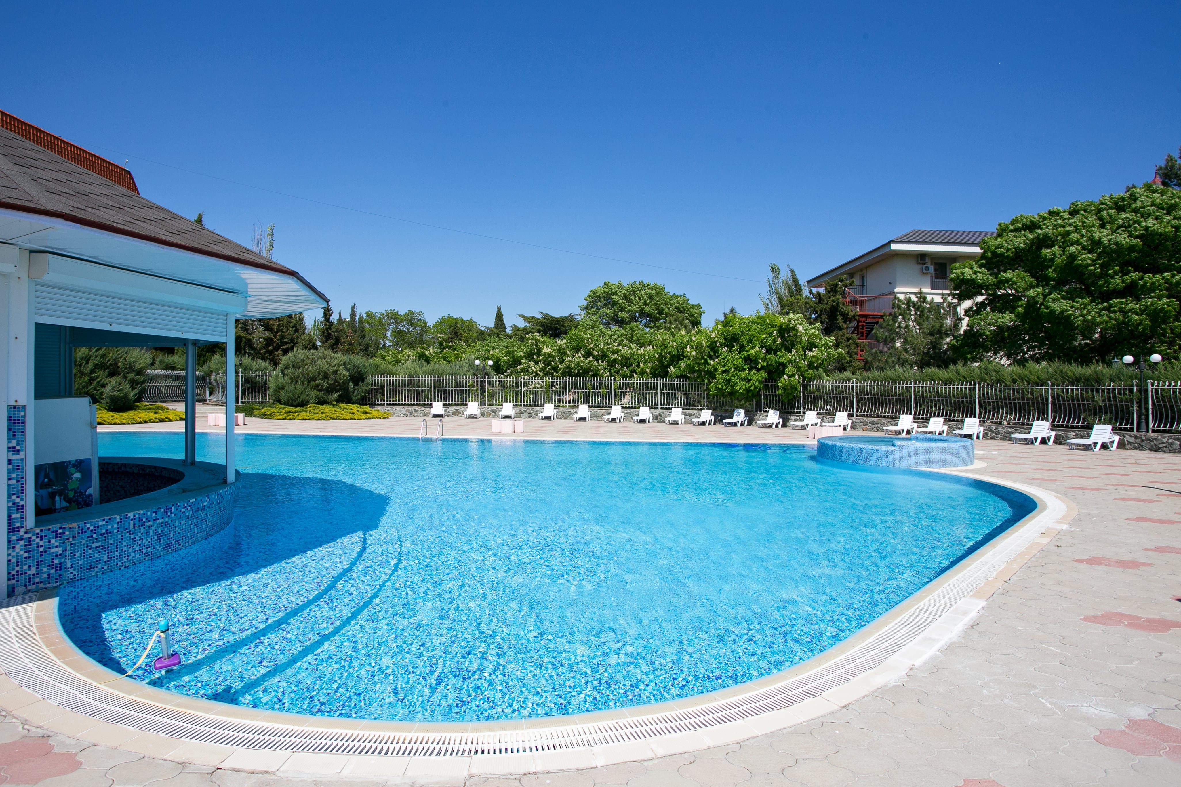 На территории круглый год работает бассейн с подогревом и джакузи 37°C. Для малышей оборудована детская зона, где они смогут играться в тени от солнца.
