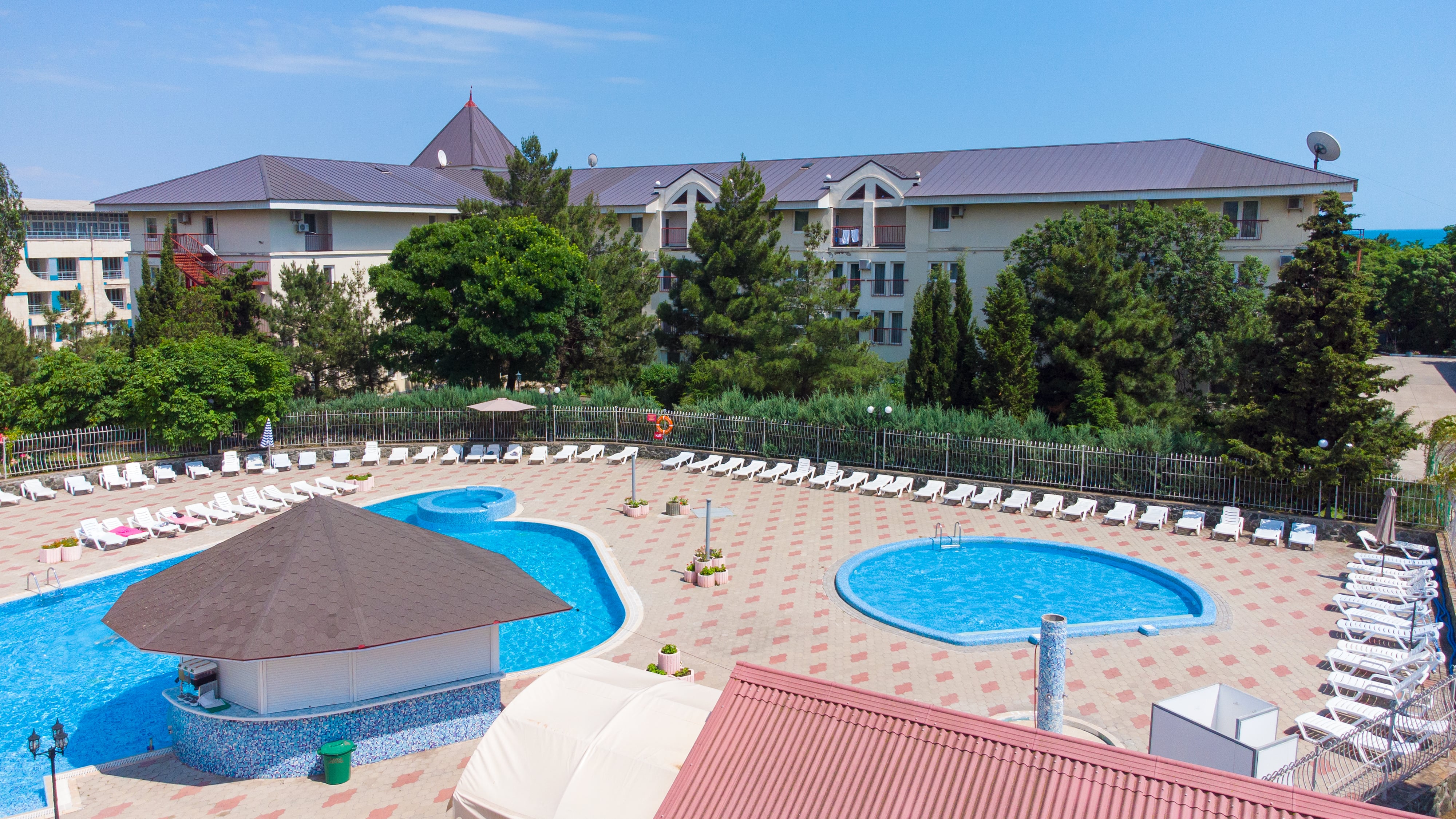 Территория пансионата великолепно озеленена, оборудована беседками, фонтаном-водопадом и похожа на прекрасный оазис.