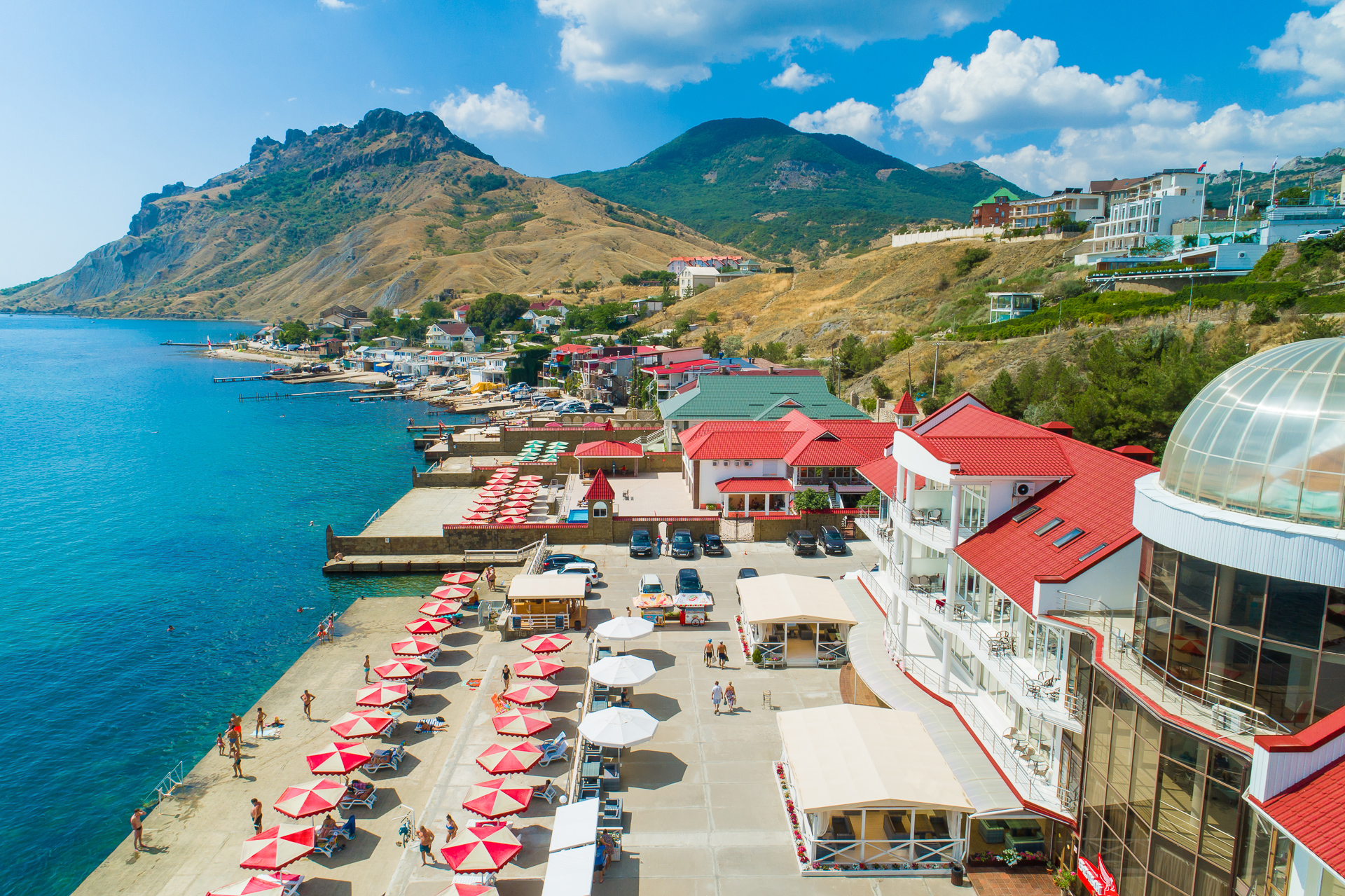 Поселок Коктебель лежит в естественно образованном невысокими горами амфитеатре, что создает особенный для Юго-восточного Крыма сухой и теплый климат.