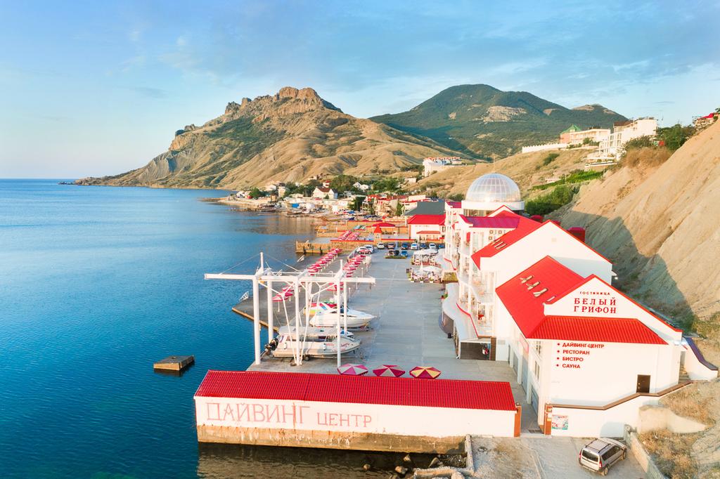 «Белый Грифон» расположен на самом берегу Черного моря в одном из красивейших мест полуострова в п. Коктебель, который отличается особой энергетикой, уникальным сочетанием степей, гор и моря, создающих неповторимый климат. Выгодное расположение – на самом берегу моря, у подножья потухшего вулкана Кара-Даг сделало возможным открытие единственного в Коктебеле дайвинг-центра международного стандарта по системе обучения PADI.