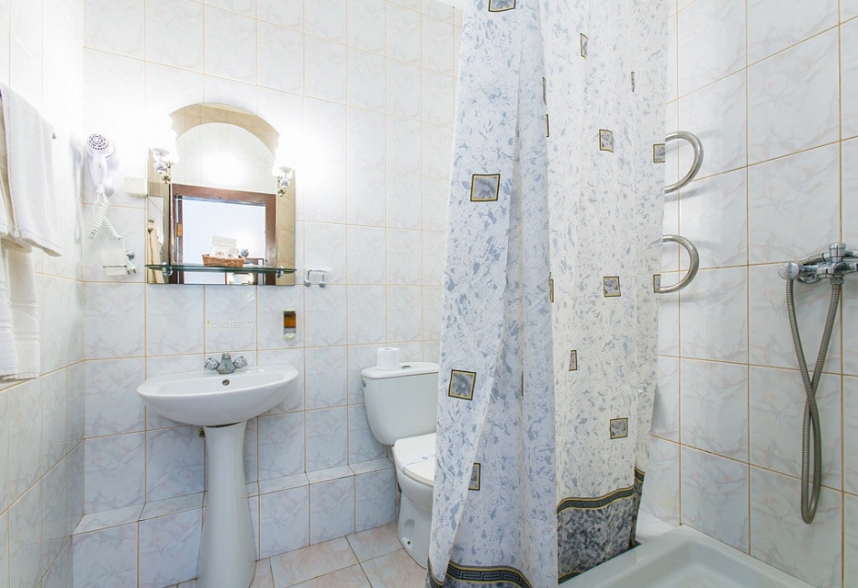 с душевой кабиной, туалетные принадлежности, фен