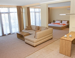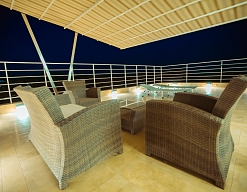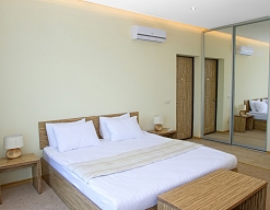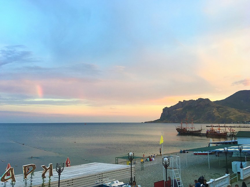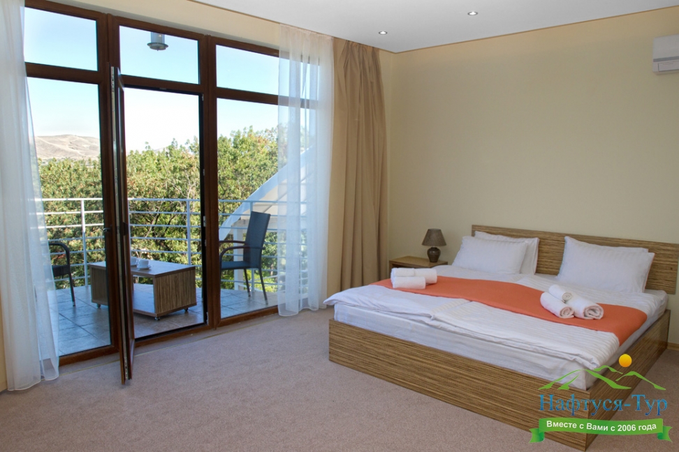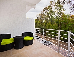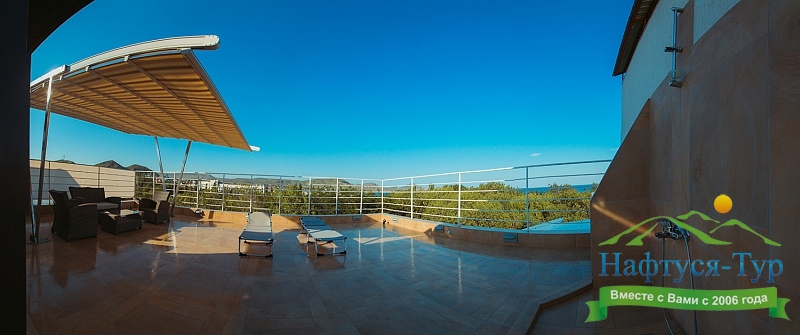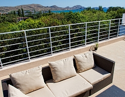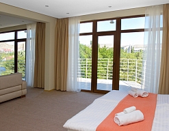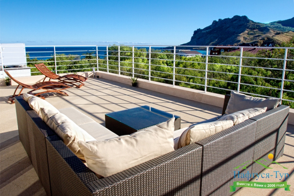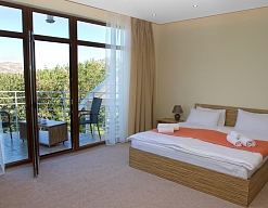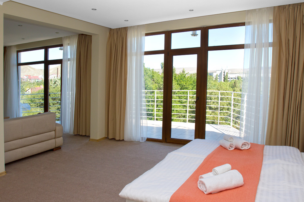 - Просторные светлые номера. Все номера без исключения оборудованы современной кухней, балконом, а на крышах номеров категории «люкс» расположена терраса с захватывающим видом на Коктебельскую бухту и потухший вулкан Кара-Даг.