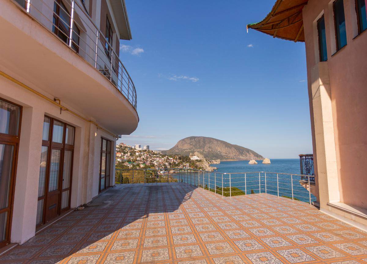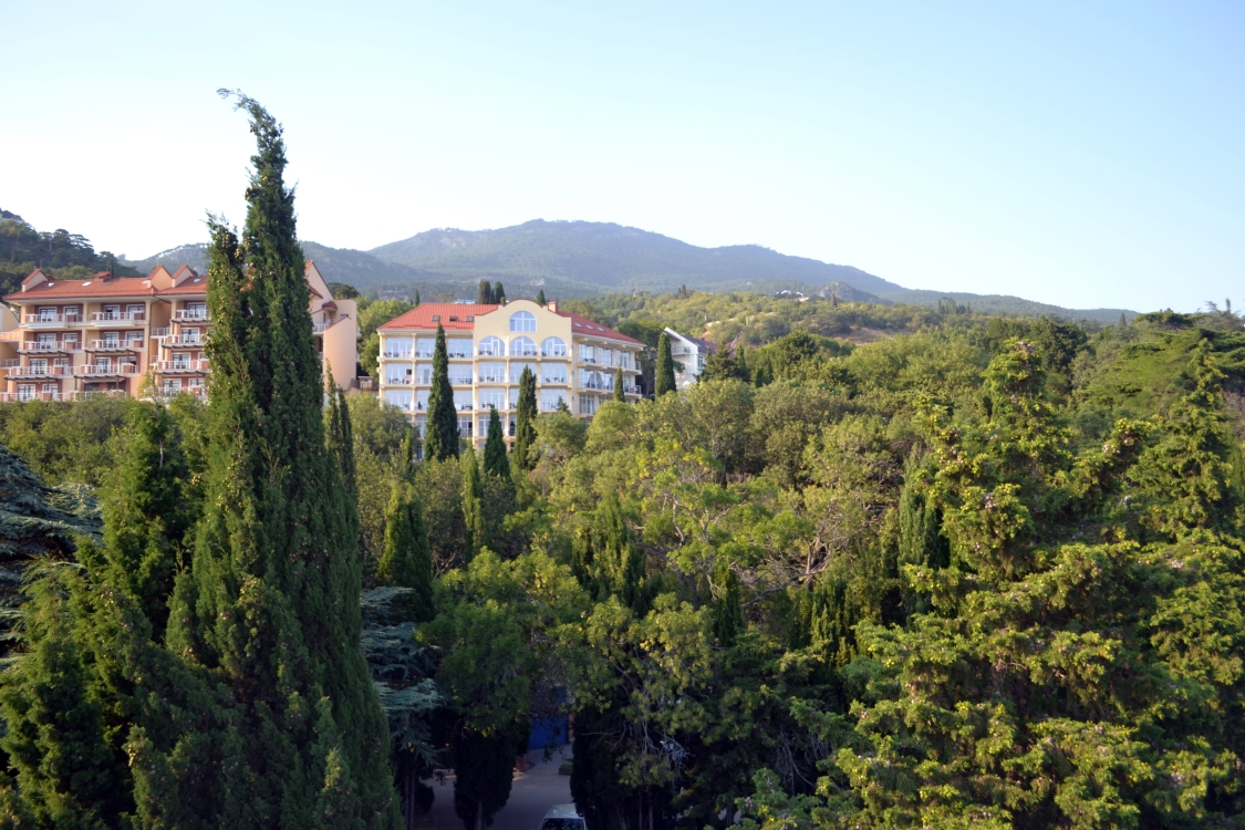 Отель возвышается над величественным парком, на территории которого растут кипарисы, столетние ливанские кедры и итальянские сосны. С террас и балконов номеров, с обзорных площадок открывается незабываемый морской пейзаж с видом на гору Аю-Даг и гурзуфскую бухту.