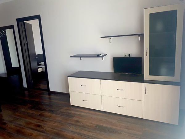 вешалка, зеркало, кровать полутороспальная, прикроватные тумбочки, столик журнальный, тумба багажная, тумба под телевизор, шкаф
