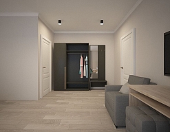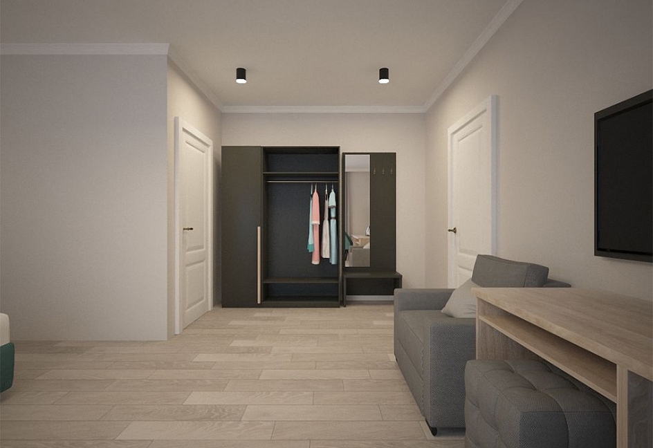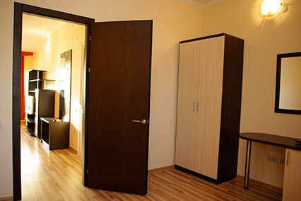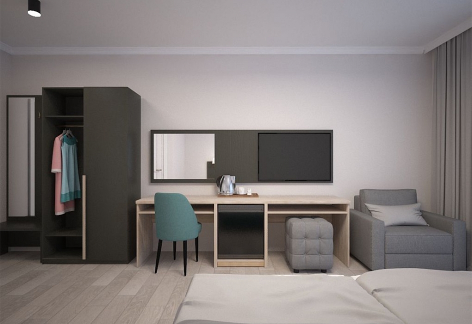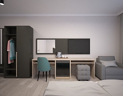 вешалка, диван раскладной, зеркало, кресло-кровать, кровать двуспальная, прикроватные тумбочки, столик журнальный, столик туалетный, стул, тумба багажная, шкаф