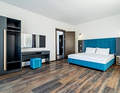 вешалка, зеркало, кресло-кровать, кровать двуспальная, прикроватные тумбочки, столик журнальный, столик туалетный, стул, тумба багажная, шкаф
