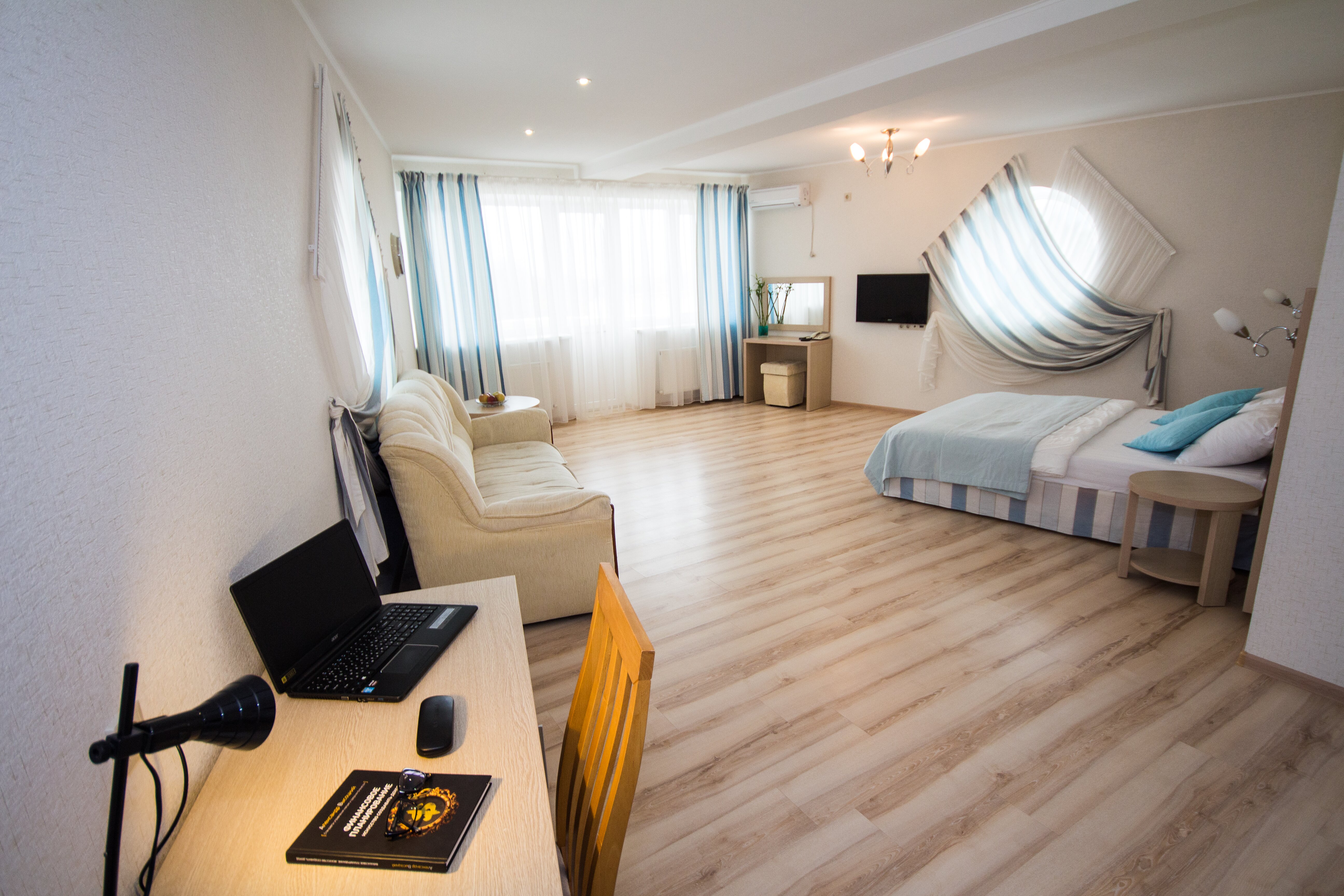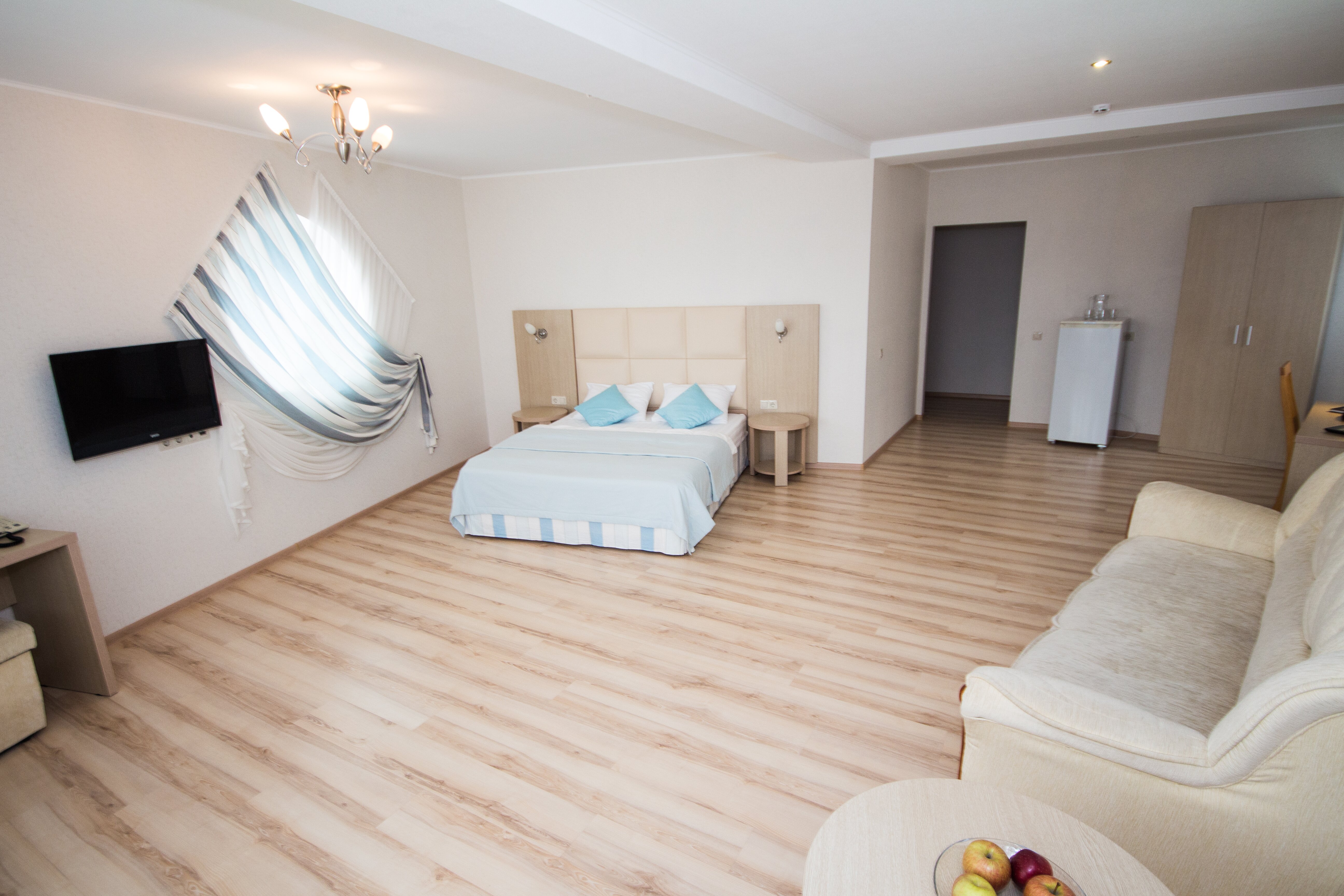 Небольшой отель, с просторным и уютным номерным фондом всего в 38 номер, из которых 31 стандартных и 7 двухкомнатный люкс. На территории гостиницы расположены: -бассейн, с комфортной детской зоной и шезлонгами для отдыха; - по всей территории гостиницы бесплатный Wi-Fi; - детская площадка; -детская комната.