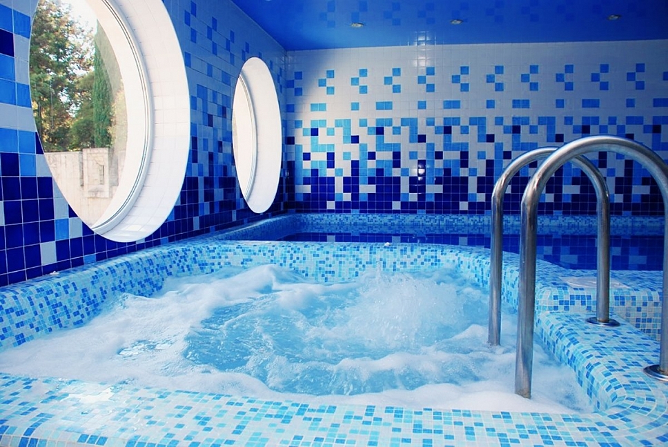 Крытый бассейн с подогреваемой морской водой. В бассейне работают 2 сауны - финская парная и турецкая(хамам), фито бар, душевые кабинки, зона отдыха с джакузи и лежаками.